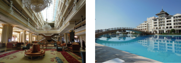 もうひとつ、Mardan Palaceを紹介しておこう。ヨーロッパ、地中海エリアで最も豪華で最も値段のはる高級リゾートホテルである。なぜ、こんな何もないところにこんな豪華で超ビッグサイズのホテルがあるのか。いろいろ尋ねて分かったことは、アゼルバイジャンの大金持ちがオーナーでトルコ政府からの働きかけもあり壮大なリゾートホテルをつくったようだ。オープニングは2009年5月、建築費用に1500億円を投資。この周辺にやがていろんなものが出来上がって、今後一帯が栄えていくものと期待されている。プールの大きさは地中海エリアでは一番の大きさを誇る。ホテル開業のパーティにはアゼルバイジャン大統領をはじめ、シャローン・ストーン、リチャード・ギア、パリス・ヒルトン、トムジョーンズその他豪華ゲストが招かれたとのこと。超ド派手なホテルである。建築分野に詳しい同行メンバーの方は、表には目立たない洗面所内の内装工事を見て、日本では考えられない工事上の不具合などが散見されると指摘されていた。一事が万事ではないが、一つの欠陥なり雑駁さがハード・ソフト両面において共通して他にもあるのではと思ってしまう。はなはだ残念である。そんなところに、日本の建築、内装技術がうまく転用されれば双方に取ってメリットが期待できる。現在、トルコと日本政府合意のもと、共同での科学技術大学設立に向け、検討委員会を立ち上げ早期開校を目指している現実もあり、様々な形で両国間に協力・協調関係が生まれその結果ビジネス関係が構築されることを願いたい。そのためには今回のような視察が双方において実施されることが望まれる。