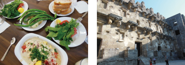 地元一番の人気レストランがあるというので、ランチに連れていってもらった。そのお店を紹介しておこう。日本の人たちもここの食事が一番だった!と認めるお店でした。日本で言えば定食屋さん。ASLIM SIMSEKというお店。アンタルヤに行かれるときは御立ち寄りください。TELは0-242-426- 37 52と0-535-638-98 80の二つがある。パンの上に乗っかった肉に更に野菜やサラダをかけて食べるのである。トルコ人の現地コーディネータもそのときだけは寡黙に食べることに集中していた。観光スポットとして、遺跡もあり、日本にいるかのような気持ちにさせてくれる風情のある滝もある。是非、皆さんにもアンタルヤを楽しんでいただきたい。