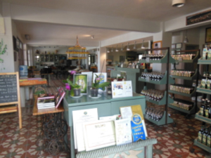Laleliの担当者とは店舗で会って話しを聞いた。オリーブオイルやオリーブ等の自社製品を販売している店舗内にレストラン&カフェがある。上の写真にあるシャンデリアらしきものはオリーブオイルが入った瓶の数々である。